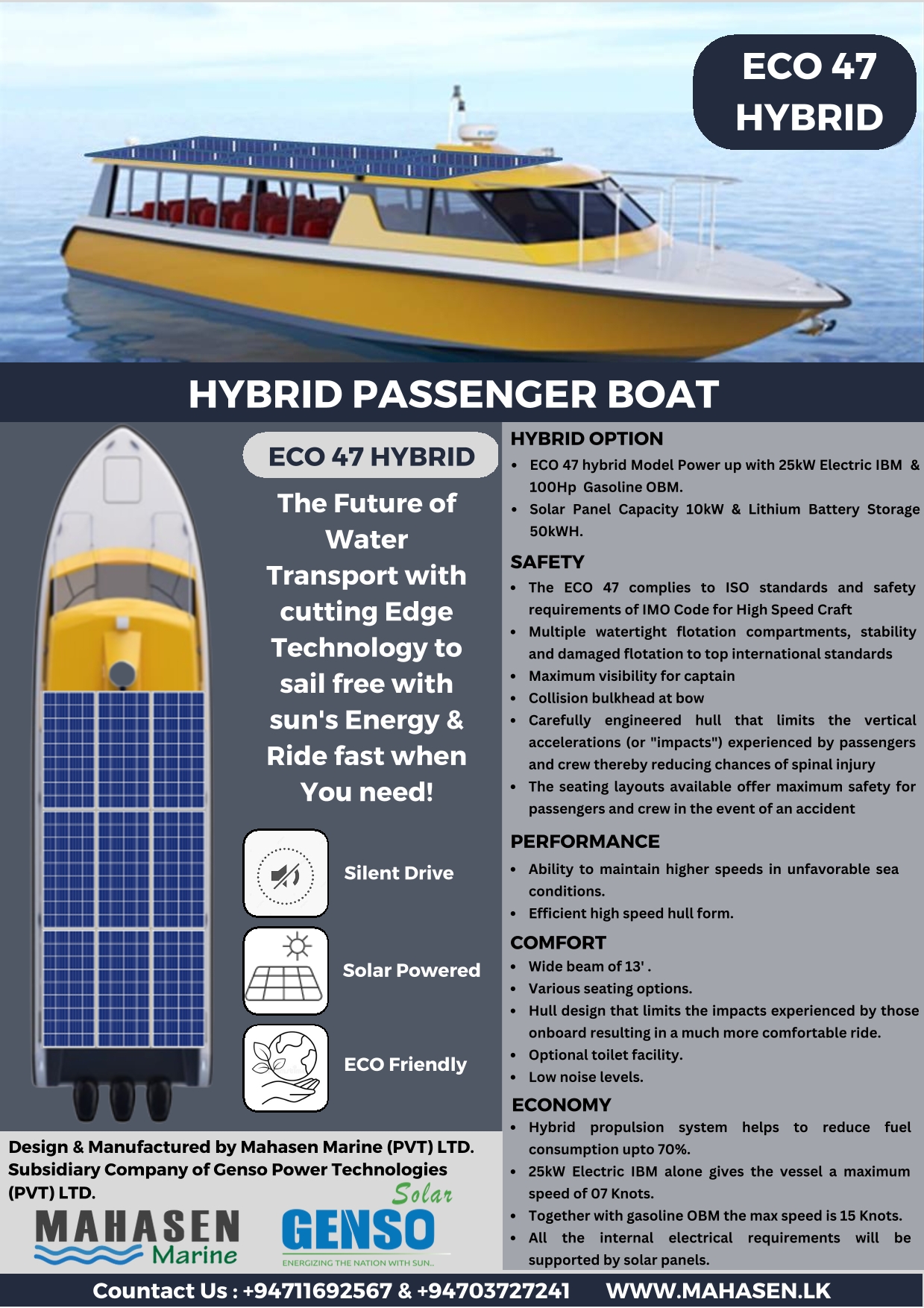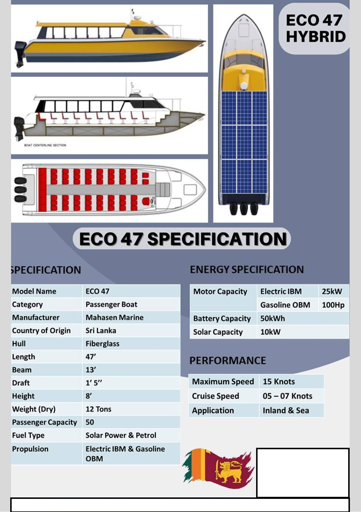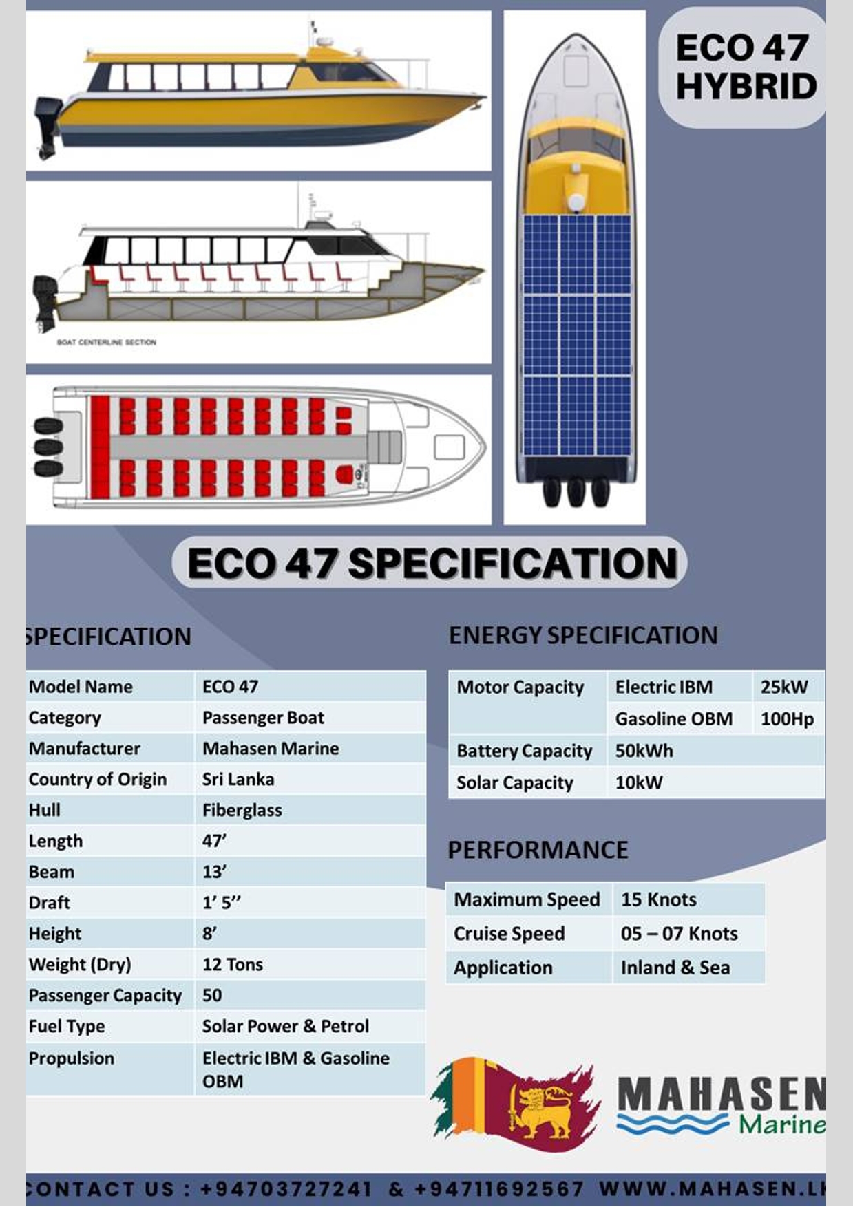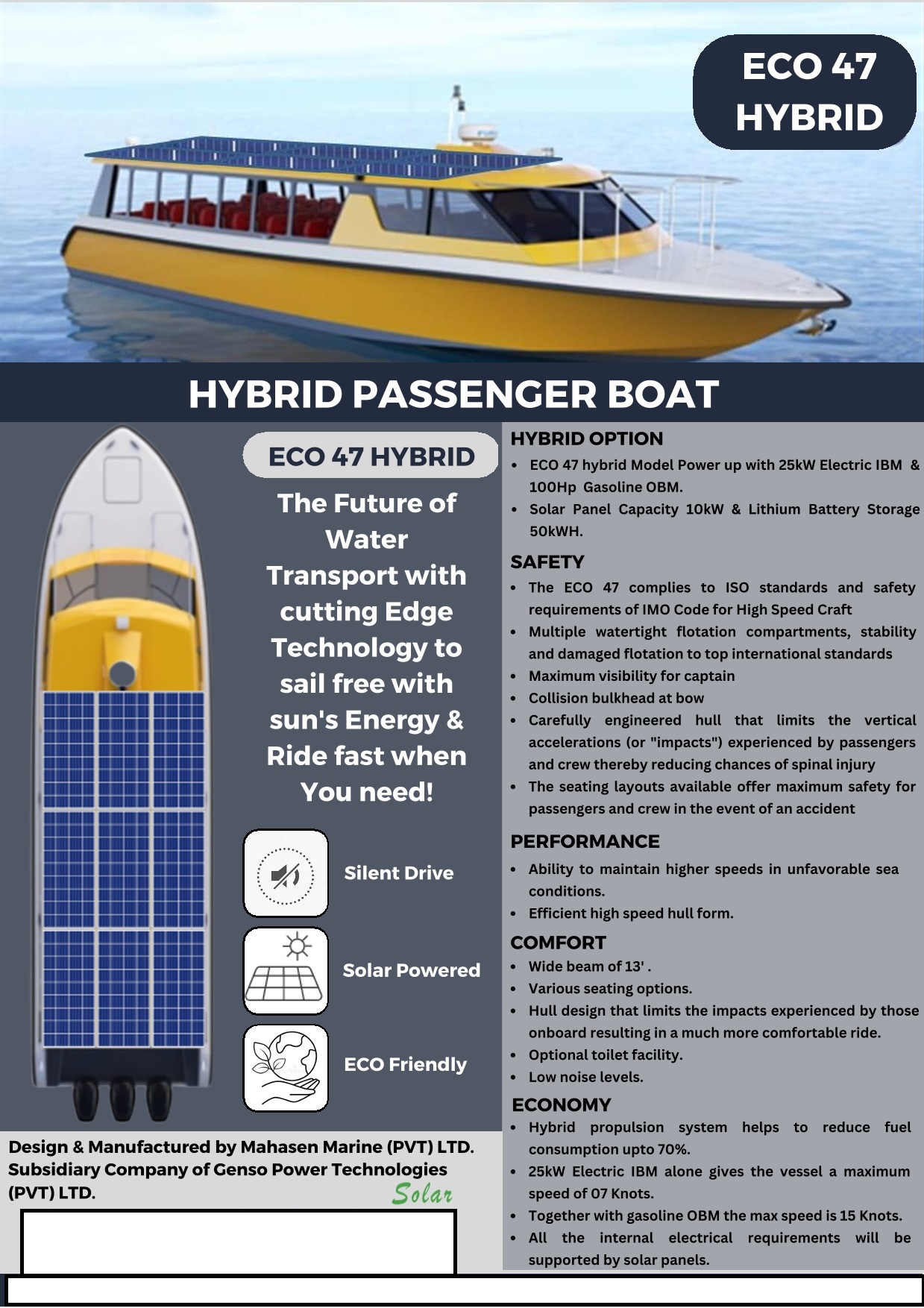 Equipped with a hybrid power system featuring a 25kW Electric IBM and a 100Hp Gasoline OBM, the ECO 47 incorporates a solar panel capacity of 10kW and a lithium battery storage of 50kWH. The boat adheres to ISO standards and complies with the safety requirements of the IMO Code for High-Speed Craft. It incorporates multiple watertight flotation compartments, ensuring stability and damaged flotation to meet top international standards.
